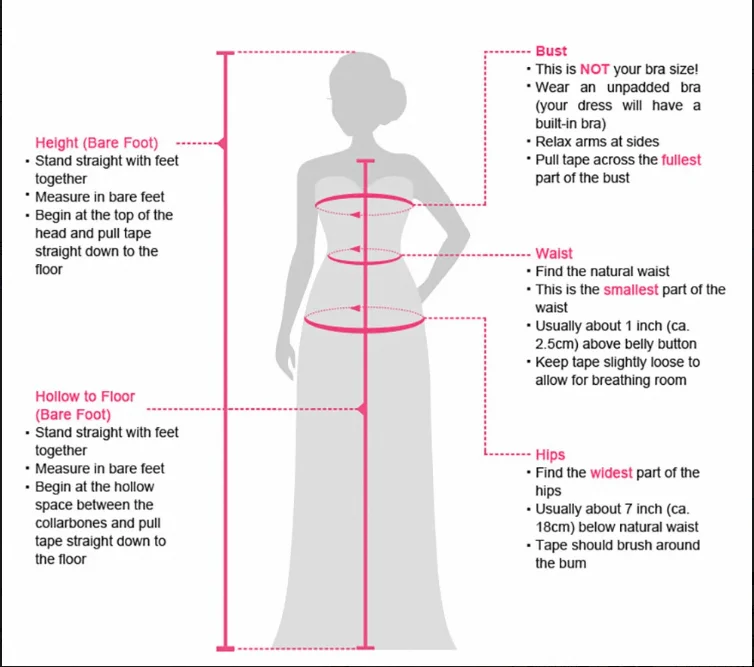 1.Bust =___inches or cm 2.Waist =___inches or cm 3.Hips =___inches or cm 4.Shoulder to waist =___inches or cm 5.Waist to floor without shoes =___inches or cm 6.Shoulder to floor without shoes =___inches or cm 7.Height =___ inches or cm(from the top of head to floor without shoes) 8.Dress color =___ (Any color choose or picture show color)